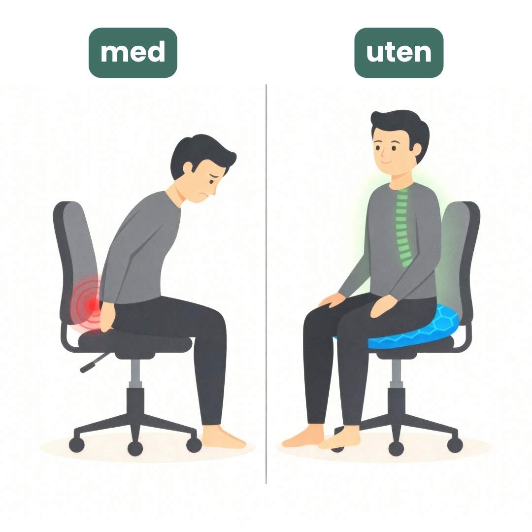 Mange brukere forteller oss at de merker mindre trykk på halebenet og korsryggen allerede etter 10–15 minutter. Individuelle erfaringer varierer.