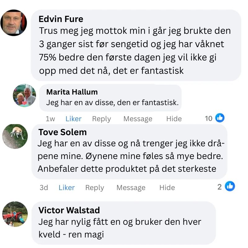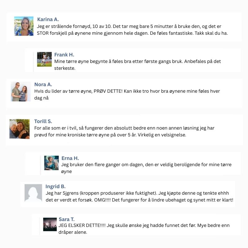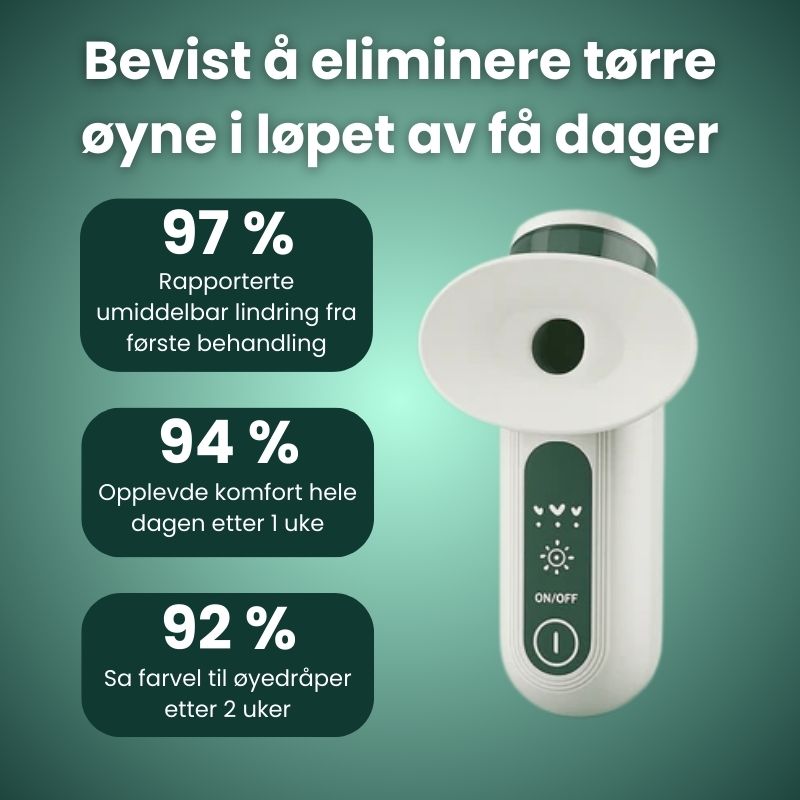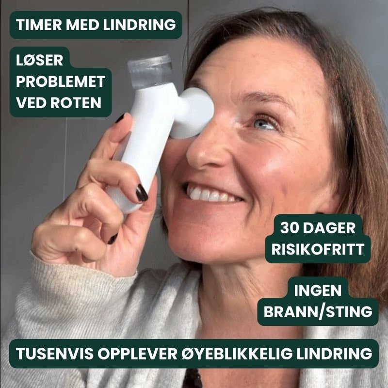De fleste kunder rapporterer om 6-8 timers betydelig lindring etter én enkelt 5-minutters behandling. Ved regelmessig daglig bruk opplever mange kunder at den naturlige tåreproduksjonen forbedres, noe som forlenger lindringens varighet over tid. Personer med alvorlige tilstander som Sjögrens syndrom kan ha nytte av morgen- og kveldsbehandlinger for optimal komfort.